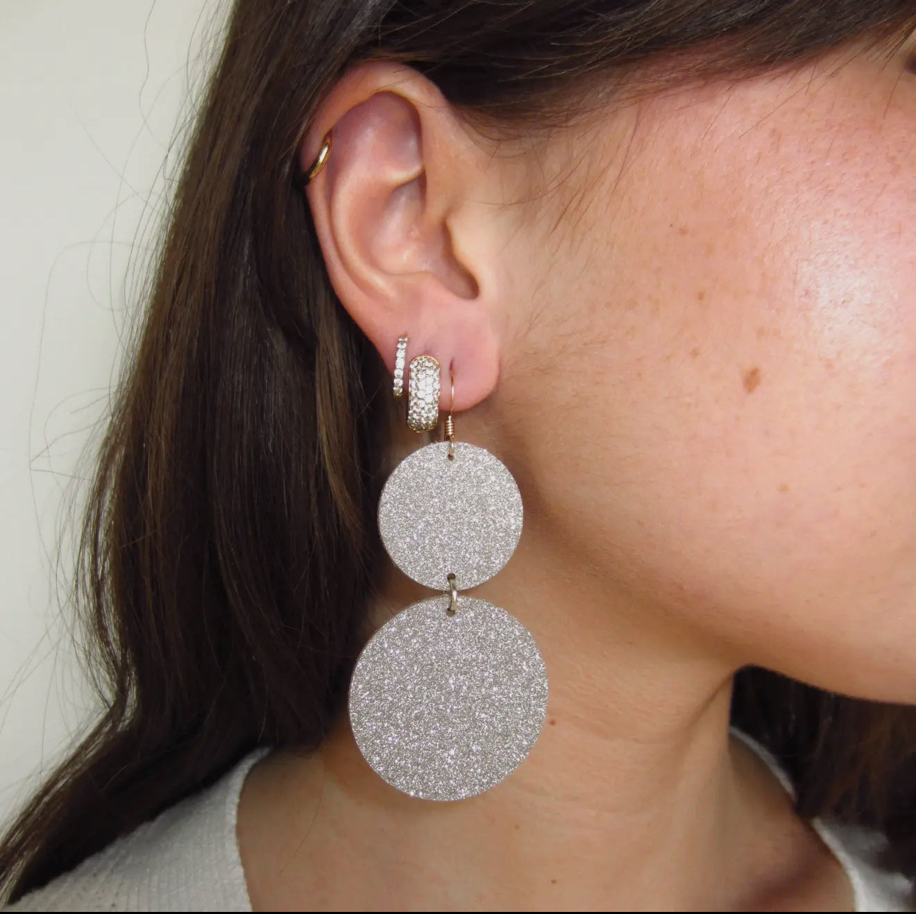 Go big with our brilliant new Devon in Champagne Sparkle leather. Featuring a fun circular silhouette, these statement earrings have the right balance of motion and weightlessness.