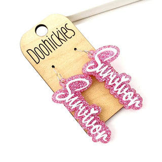 2" Survivor Pink Glitter Layered Acrylic Earrings - Breast Cancer Awareness Earrings
