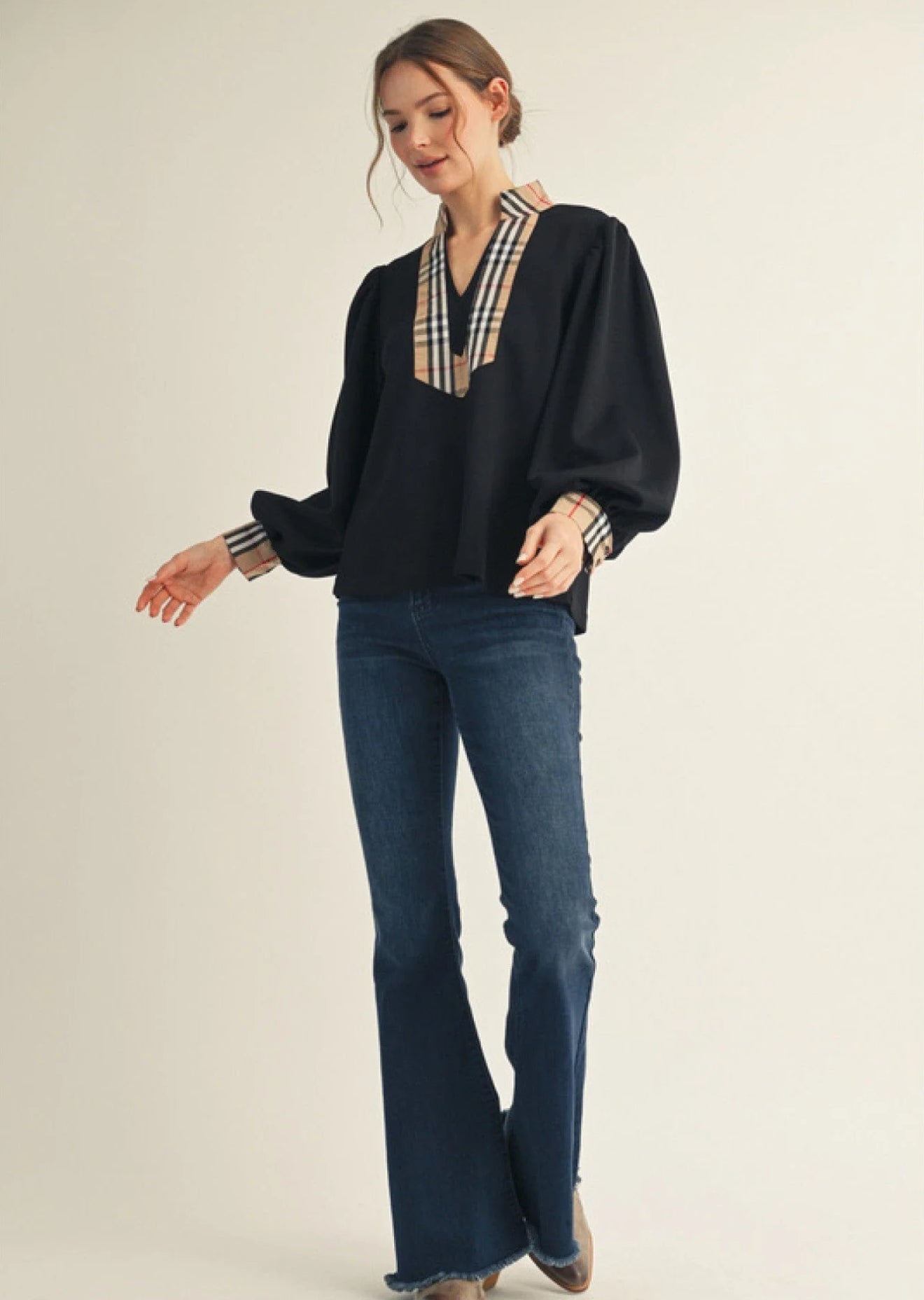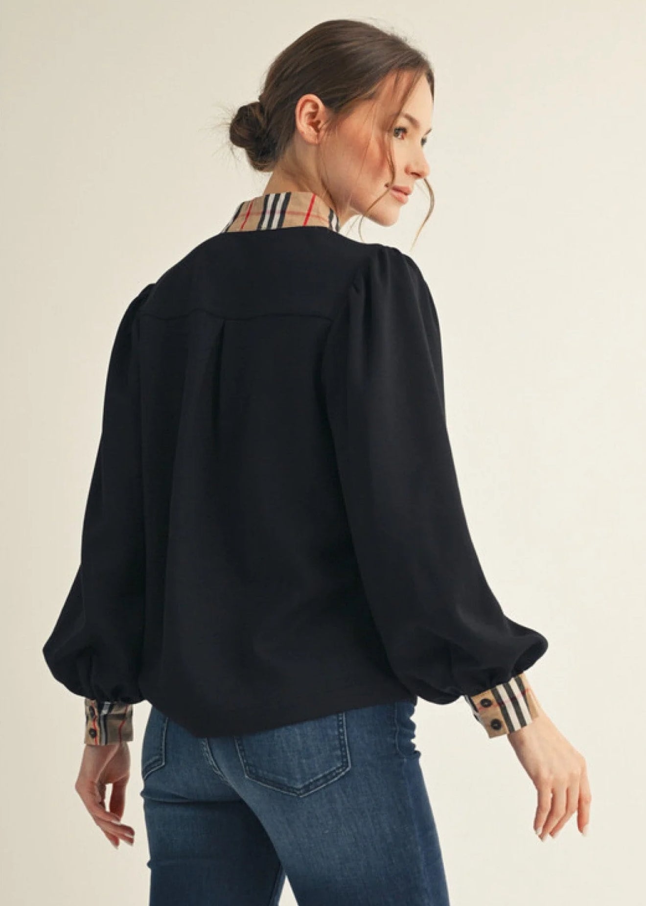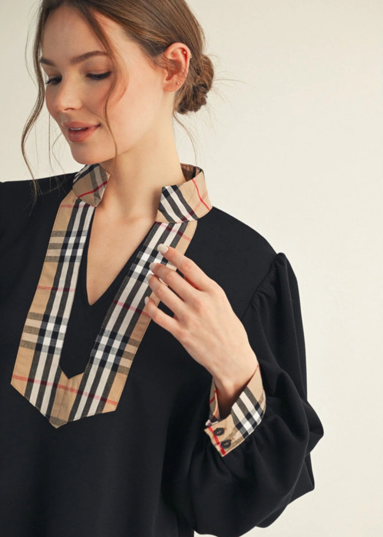 Features charming puff sleeves and a playful plaid contrast accent, this top brightens up any outfit with a flirty flair. Perfect for layering or wearing solo. It's a stylish way to showcase your cheerful side.