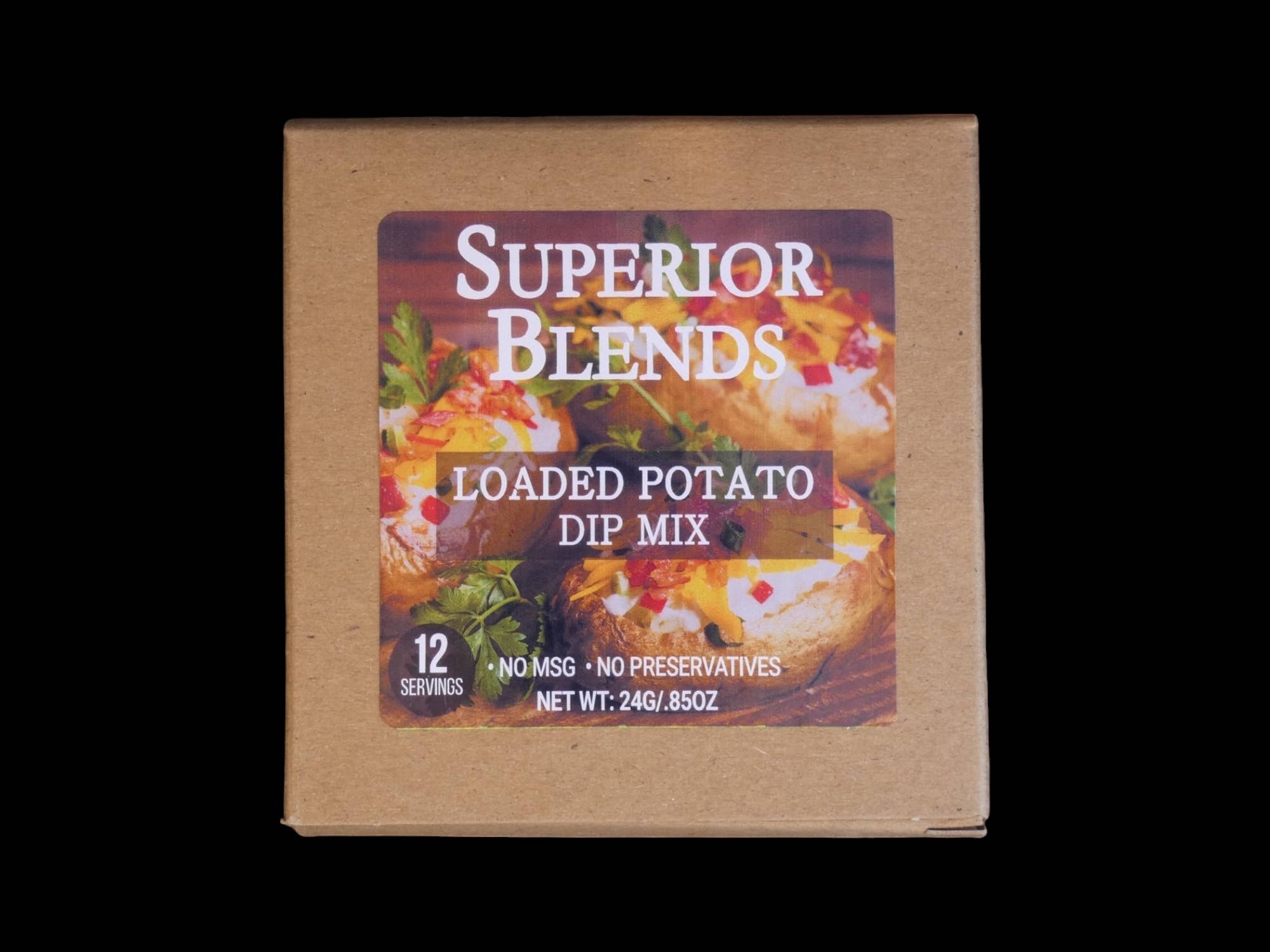 Stand up box perfect for display - Box contains 1 Loaded Potato Dip Mix Packet - Cheddar Cheese (Cheese, Cheese Cultures, Non-Fat Milk, And Salt), Bacon Bits (Soy Protein, Natural Smoke Flavor, And Salt), Red Bell Pepper, Onion, Chives, Buttermilk Powder, Garlic, Salt, And Spices.