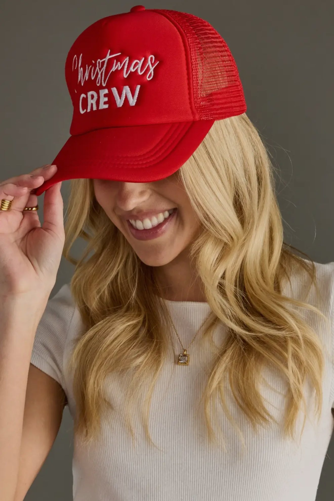 Red foam trucker hat with white embroidered "Christmas Crew"