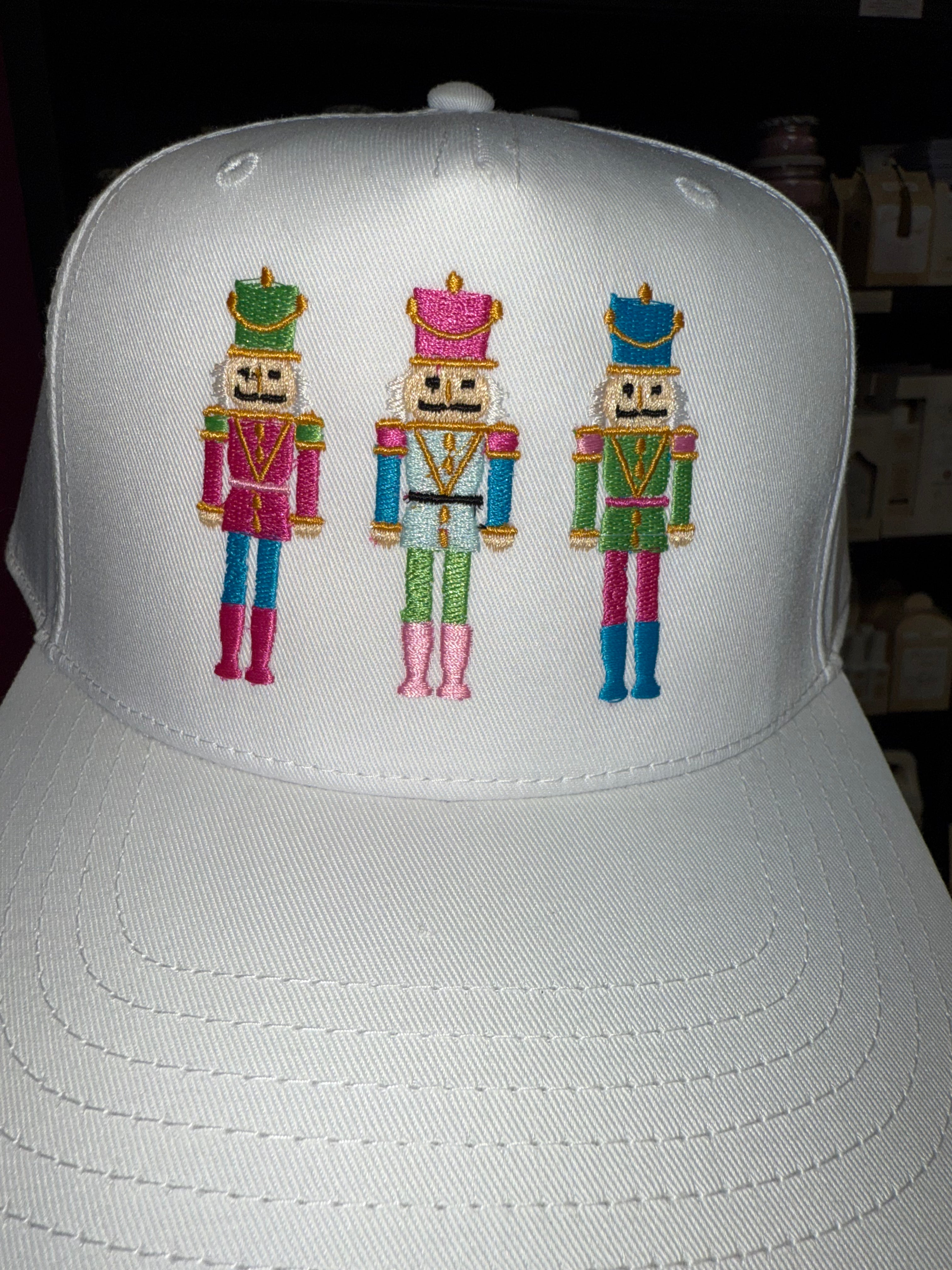 Elevate your seasonal style with this expertly crafted canvas hat featuring three intricately embroidered nutcrackers across the front. The crisp white base provides a clean, versatile canvas that complements any wardrobe, while the detailed embroidery adds a touch of festive sophistication. Perfect for holiday gatherings, winter outings, or year-round wear for those who appreciate classic holiday aesthetics. The durable canvas construction ensures lasting quality and comfort, making this hat both a practical accessory and a conversation piece.
