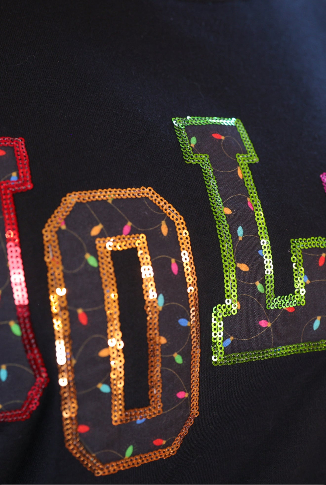 The Jolly Patch Pullover features a timeless black foundation embellished with black "Jolly" patches, each outlined in vibrant multicolor trim and decorated with festive Christmas lights. This holiday sweater offers a refined yet lively addition to your seasonal wardrobe, ideal for creating a chic and spirited look.