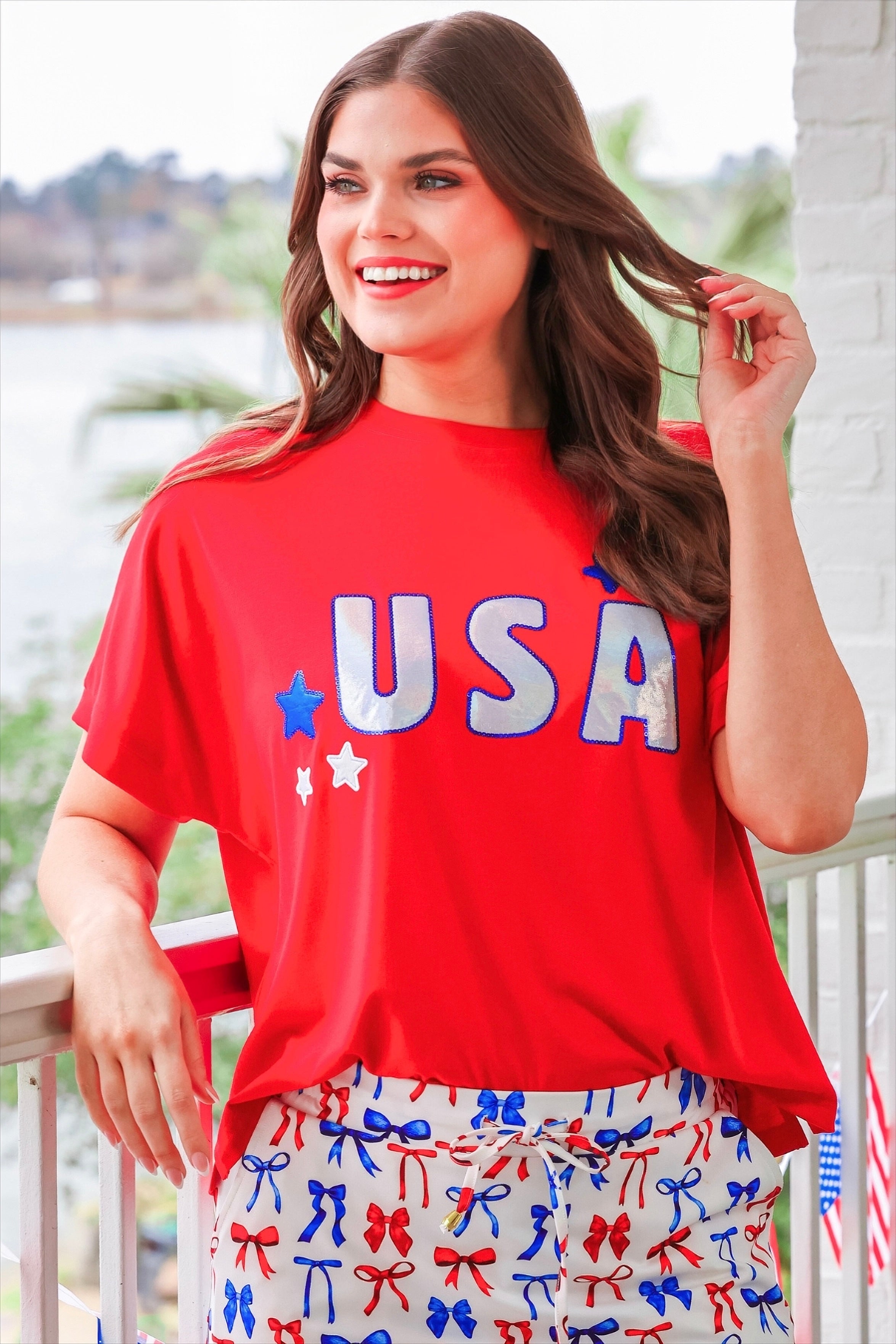 Rock your red, white, and blue with this dazzling USA Foil Luxe Top! Decked out in eye-catching metallic foil patches and vibrant Americana stars, this luxe creation brings the perfect dose of patriotic pizzazz. Ideal for Fourth of July celebrations or whenever you're feeling your patriotic best, this playful piece combines comfort with serious sparkle. Grab yours and let your stars shine!
