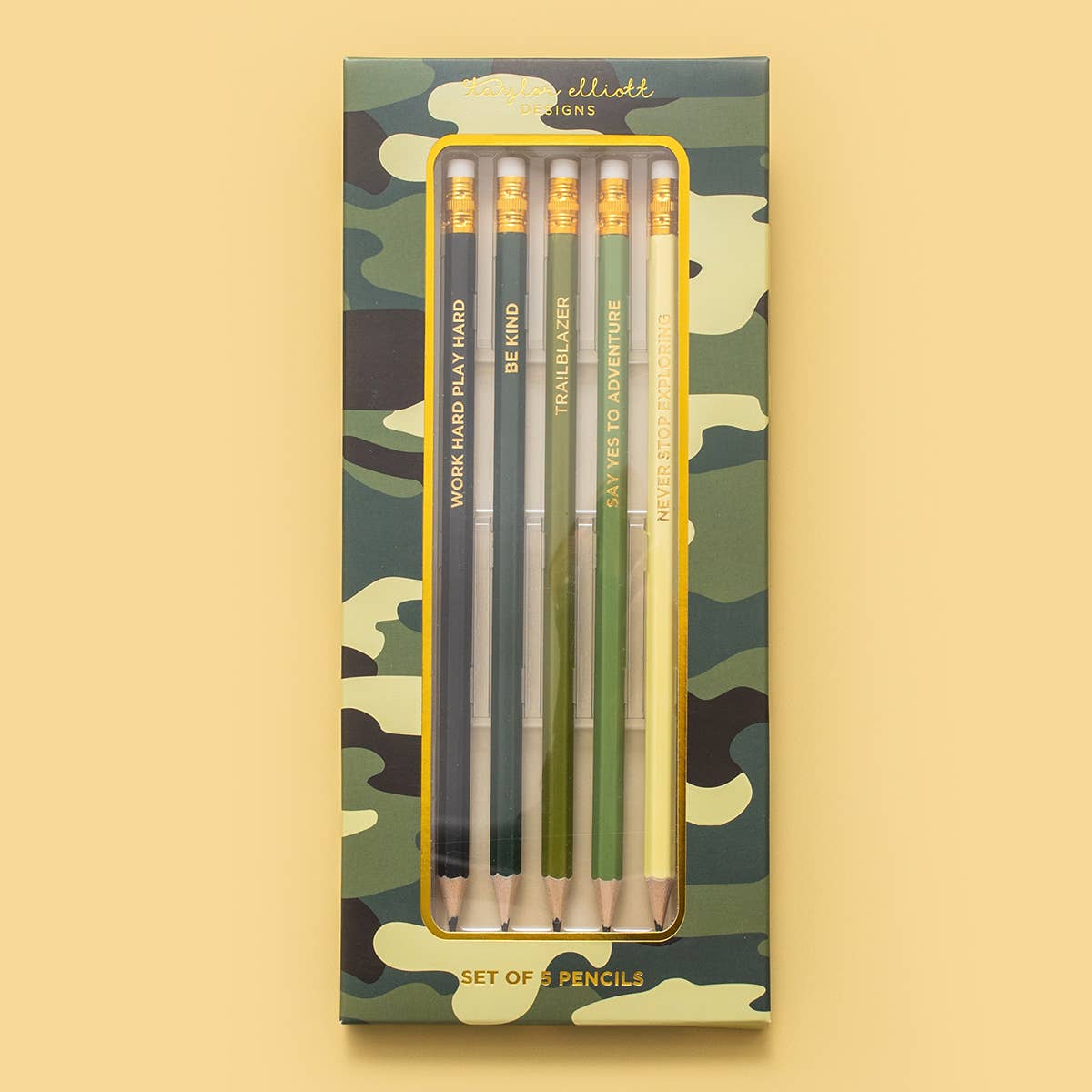 Original price was $5.00, so you're getting a steal of a deal!! This pencil set comes with 5 motivational & empowering phrases in metallic gold foil and super cute packaging, making this a perfect gift for any man, woman or military member. Whether giving the set as a gift for Father's Day, a Birthday or graduation, these pencils will make a statement and show just how much someone is truly appreciated. Pair this set with the matching note card set to make the gift even more special. Details * 5 sharpened pencils * Box size: 4.06” x 9.25” x 0.5” * Pencil size with eraser (sharpened): 7.5” * Metallic gold foil imprinting on pencils and box * Erasers are latex free * Gift box packaging * Imported Pencil Sayings: Work hard play hard Be kind Say yes to adventure Trailblazer Never stop exploring