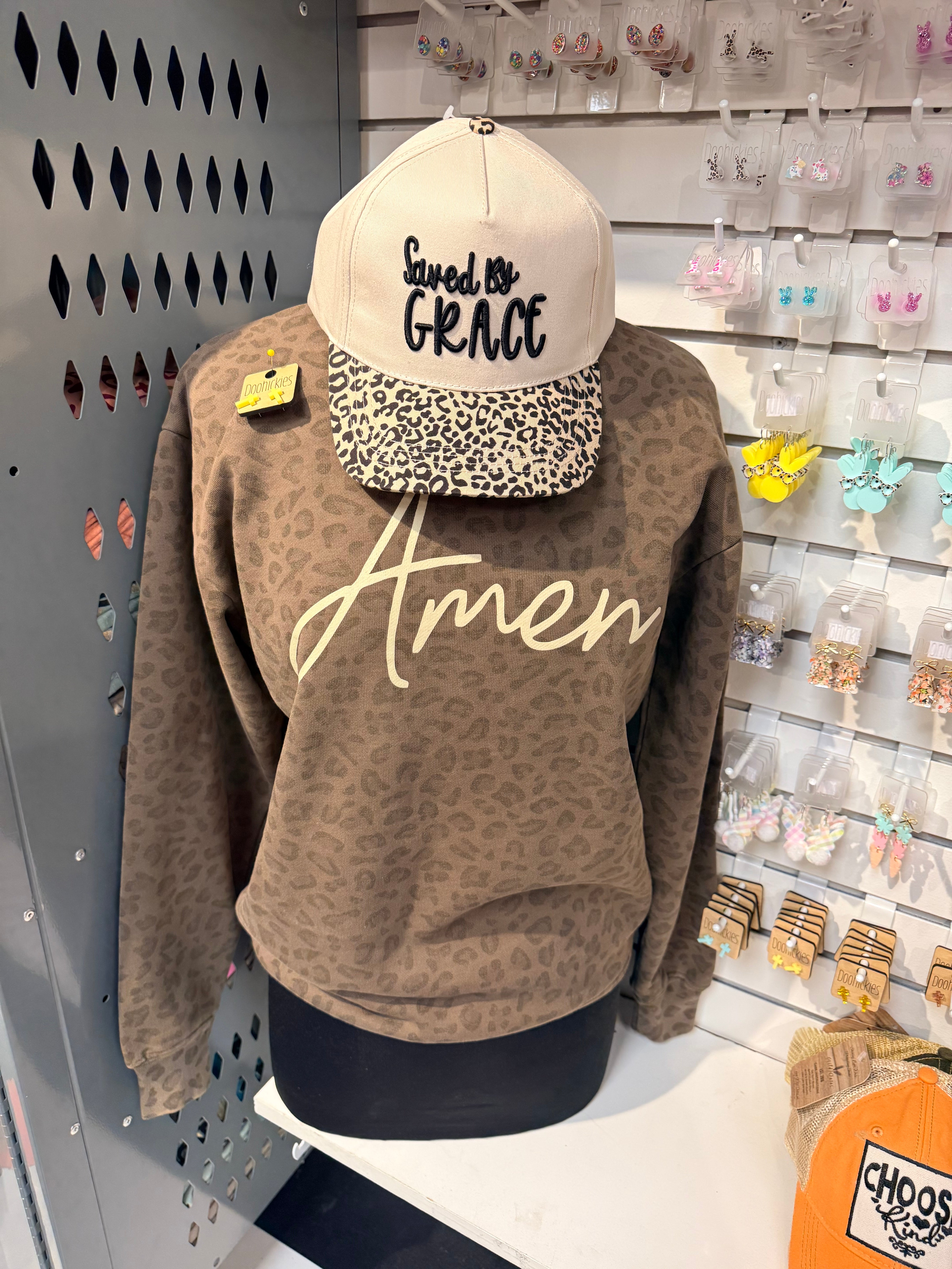 - Leopard print sweatshirt with “Amen” script design