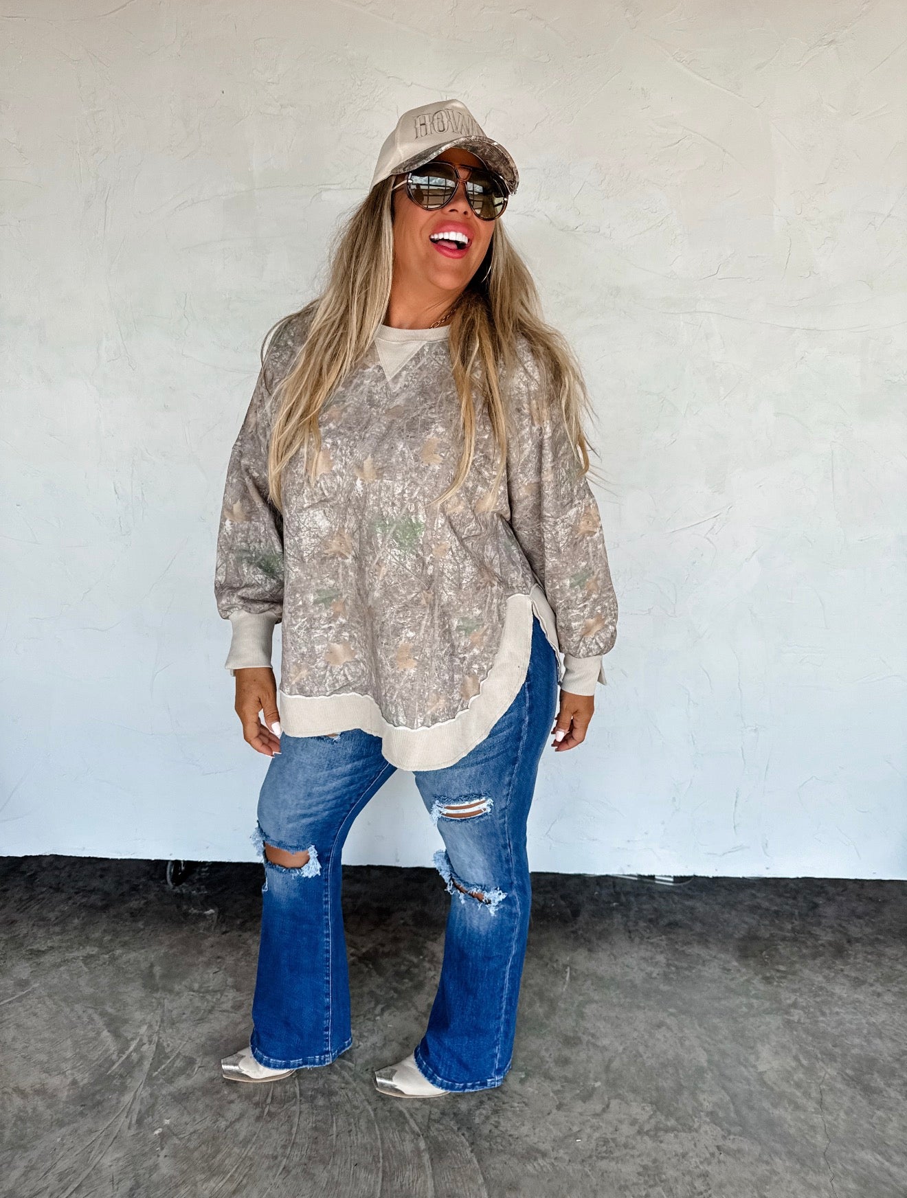 The perfect washed cotton flattering sweatshirt that everyone needs! Faded “vintage” colors. Features flattering rounded front and back hem with side slits!
