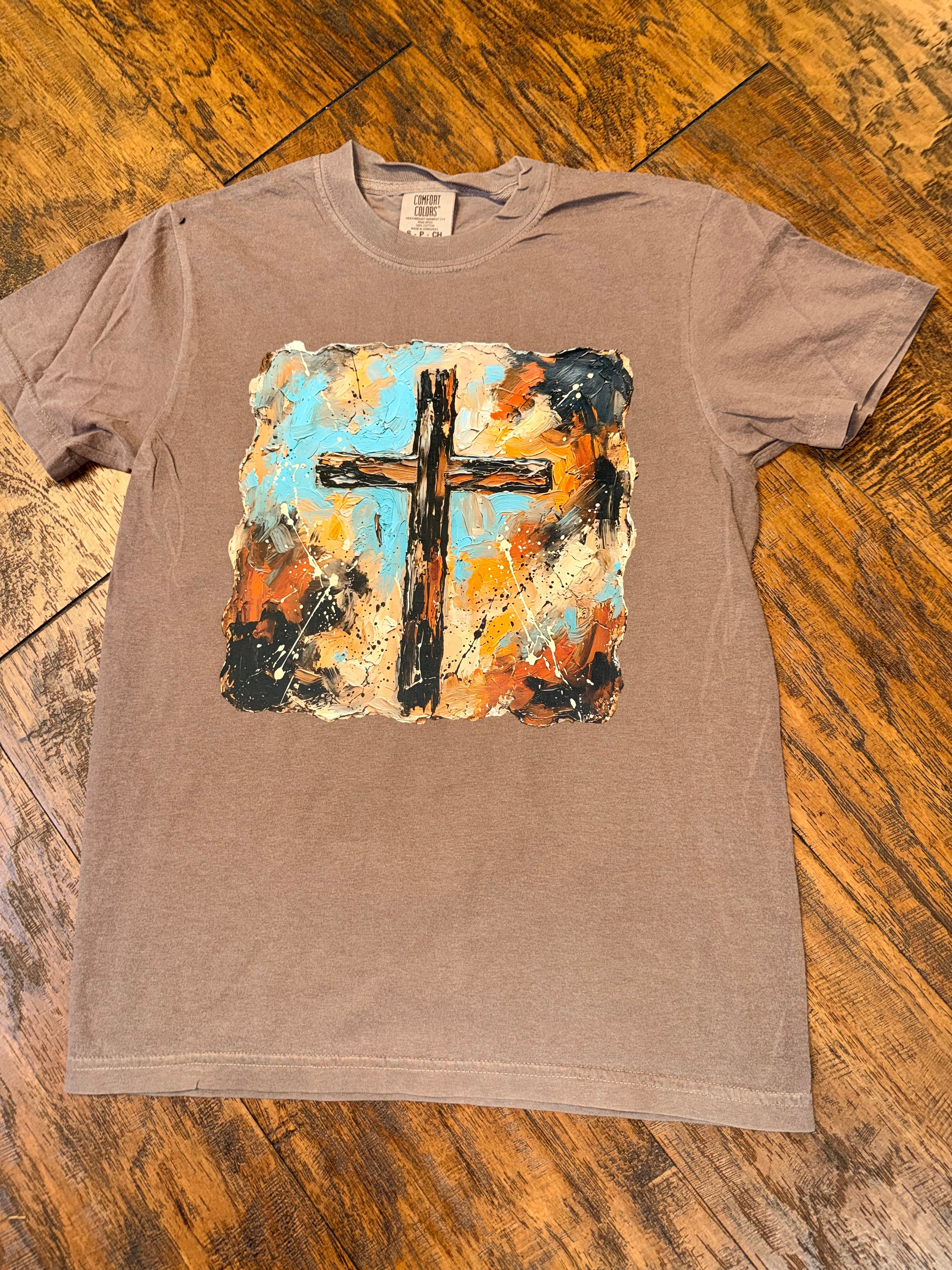 Faith meets fashion in this stunning painted cross tee. Set on a rich espresso-colored Comfort Colors shirt, this design features a bold, hand-painted style cross with warm tones of teal, cream, rust, and black that give it a true work-of-art feel. Every detail makes this tee stand out while still being easy to wear every day.