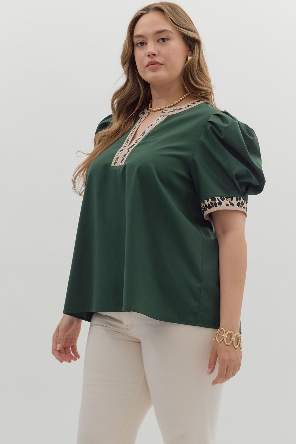 Solid pleated short voluminous sleeve pullover top featuring accented leopard print split v-neck and band. Unlined. Woven. Semi-sheer. LIghtweight.