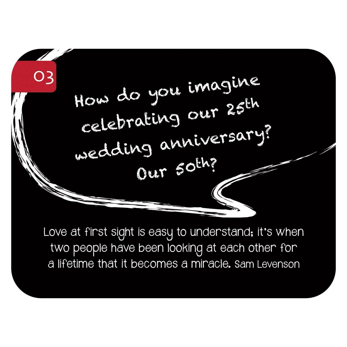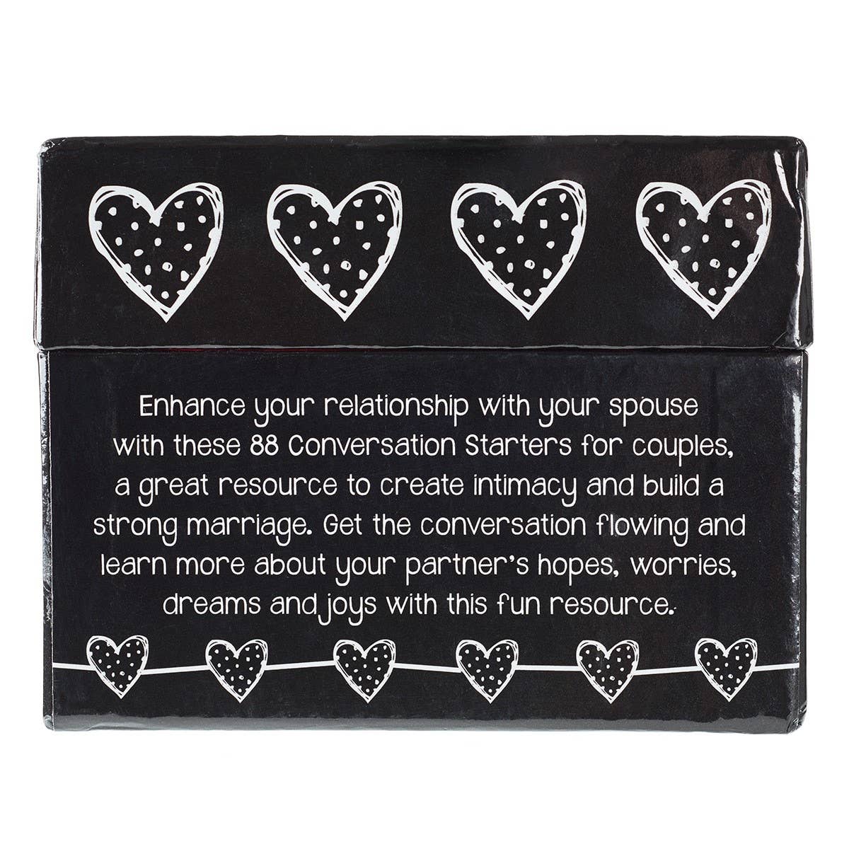 Conversation starters by Rob Teigen is a fun way couples can get to know one another better. Each card has a question and an accompanying Scripture verse or quote that is sure to spark some lively conversation and lots of laughter. Black and white lidded box, Question format, Includes Scripture and quotes, 44 double-sided cards, Card size: 3.25" x 2.25" (83 x 64 mm), Box size: 4.6" x 3.5" x 1.2" (117 x 89 x 31 mm)