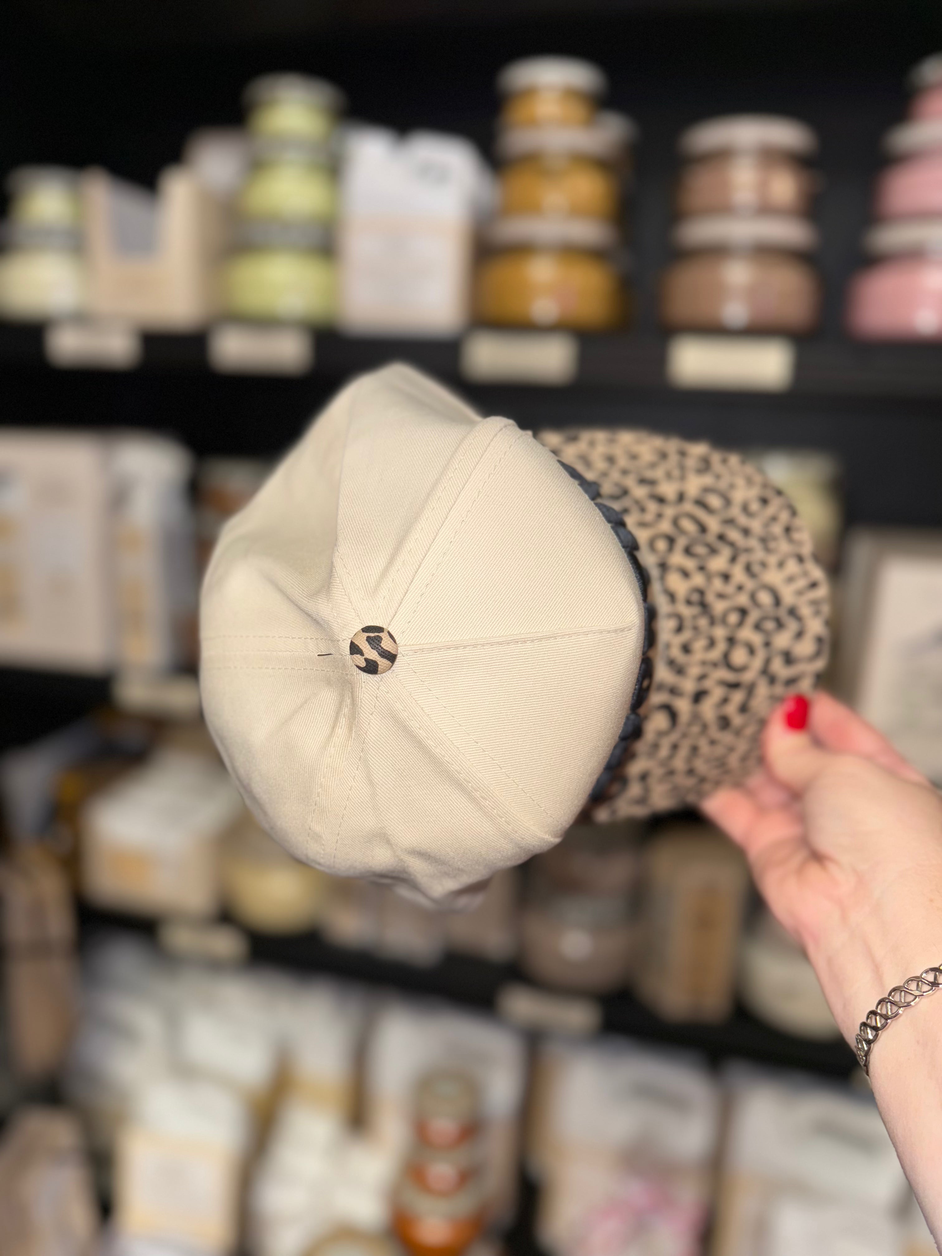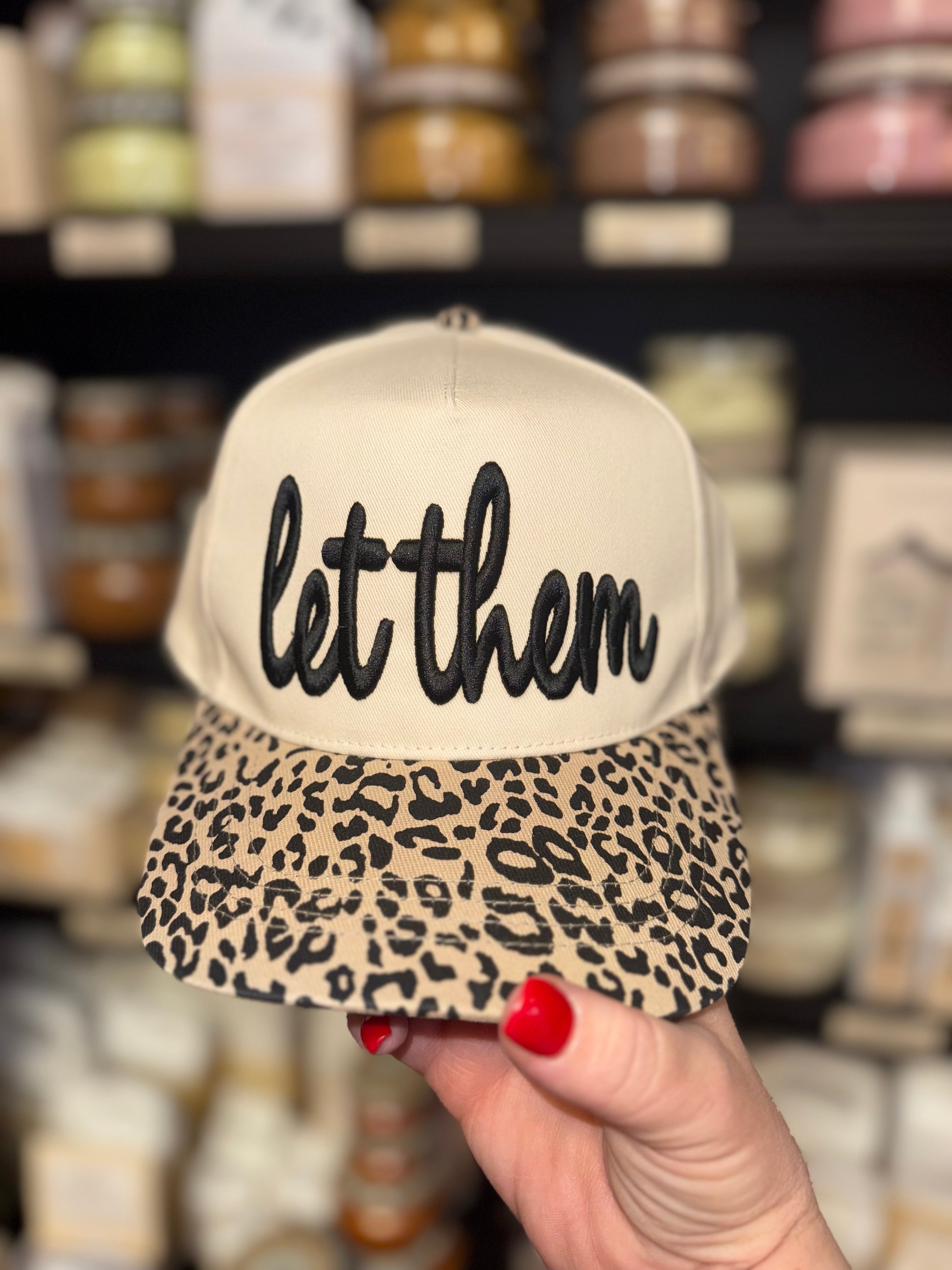 This structured fabric hat showcases puff embroidery with the phrase "let them." It is enhanced by a stylish leopard-print brim and a matching leopard button on top. The snapback closure provides an adjustable, secure fit.