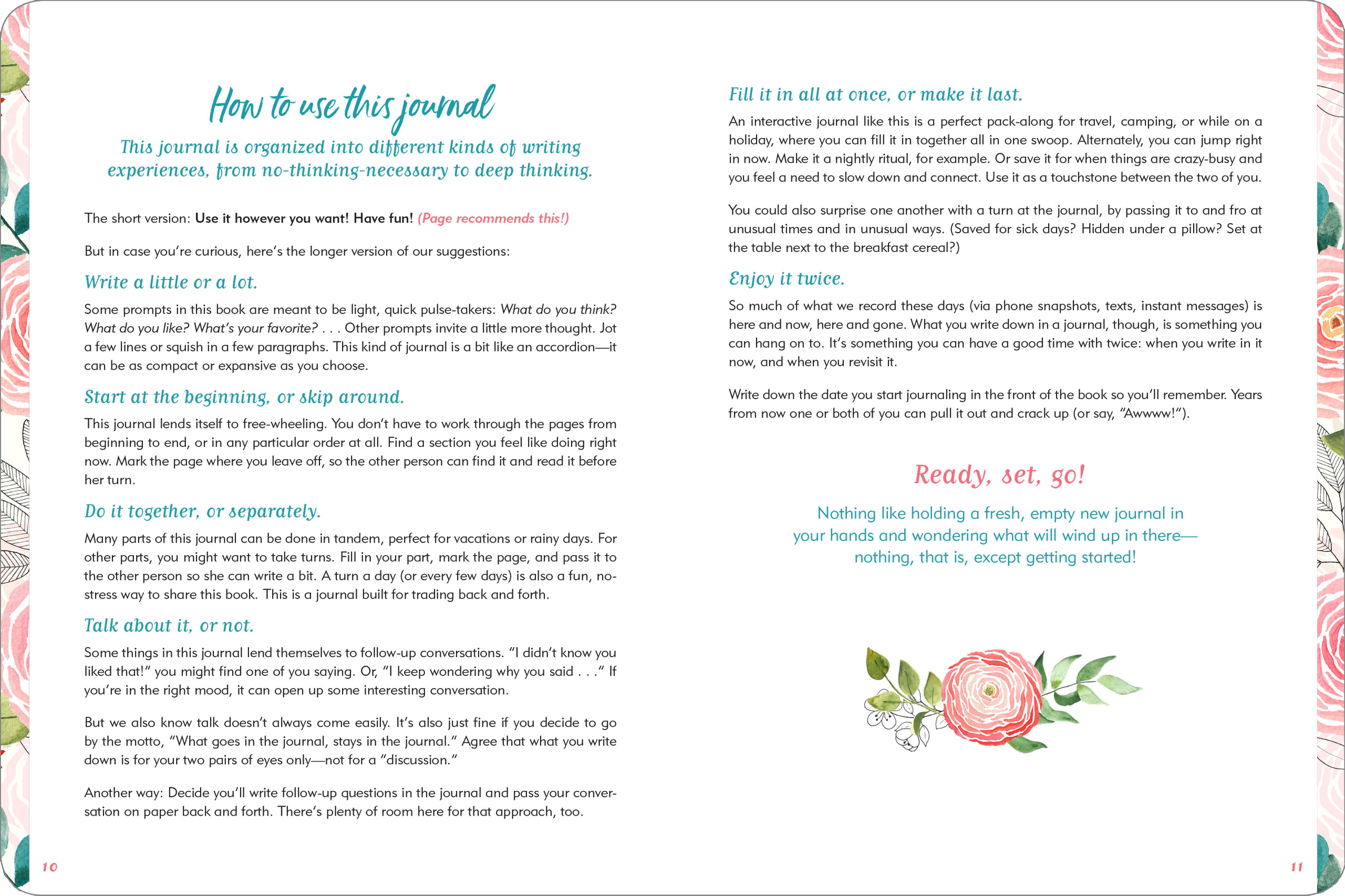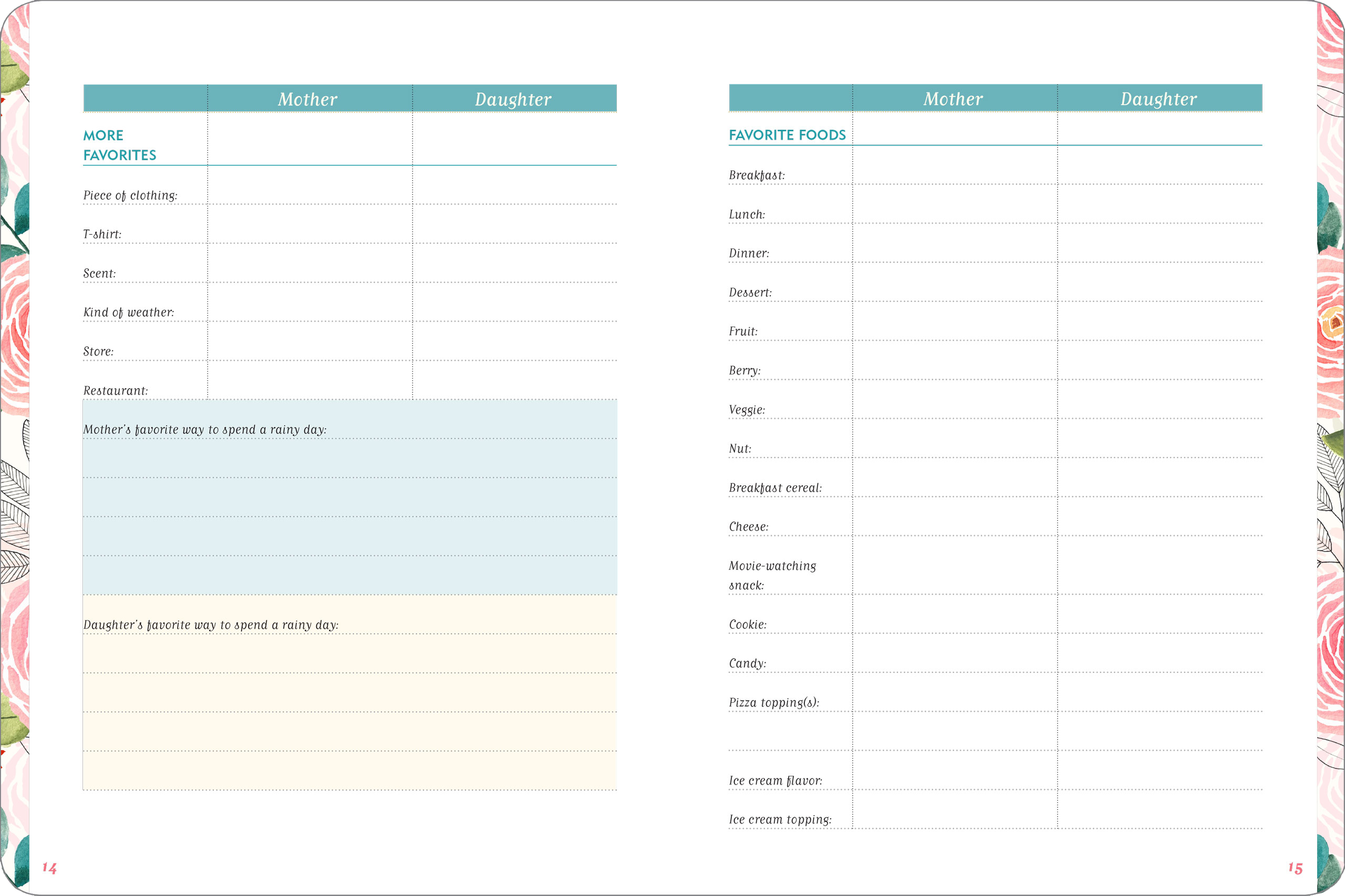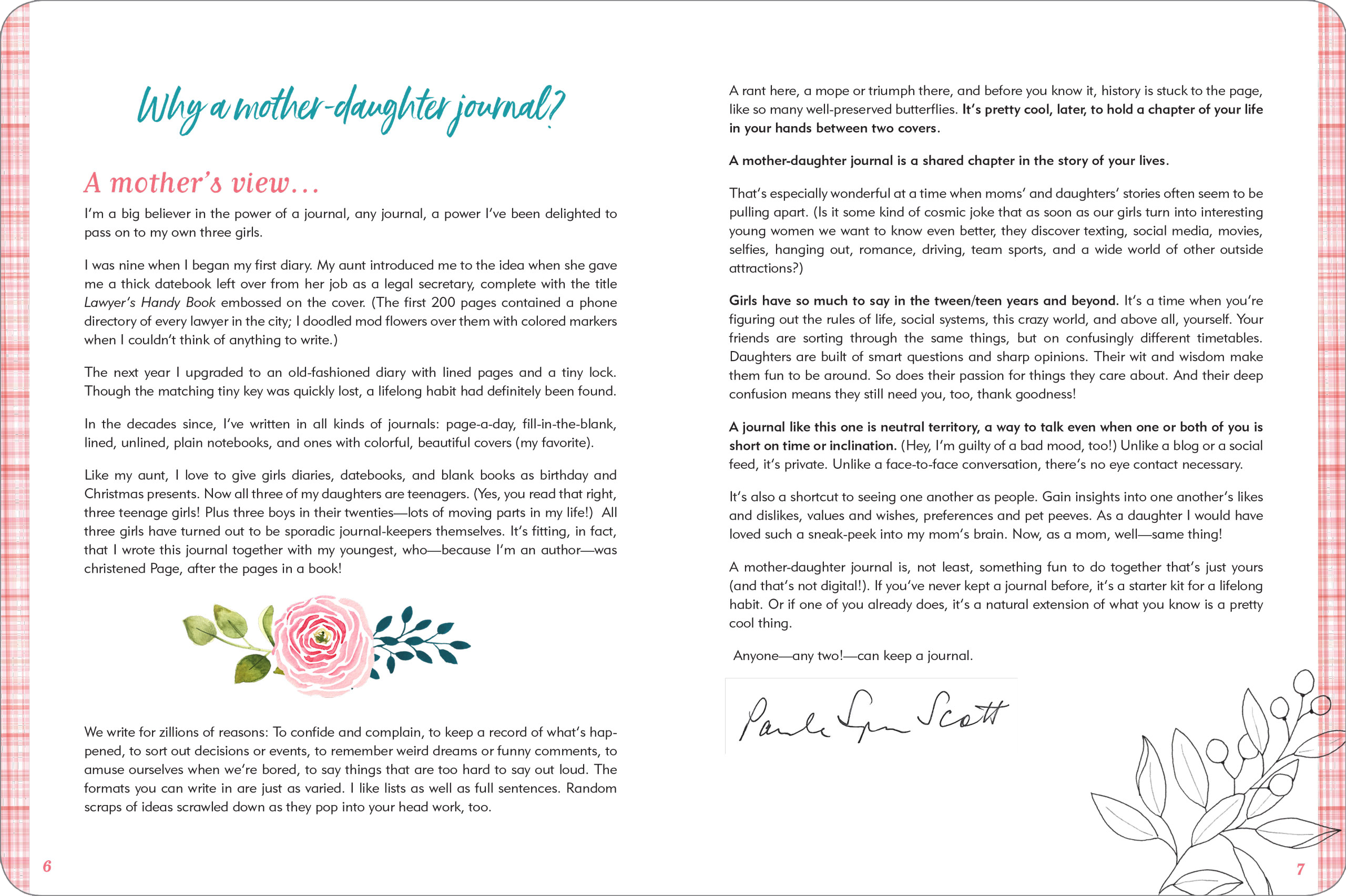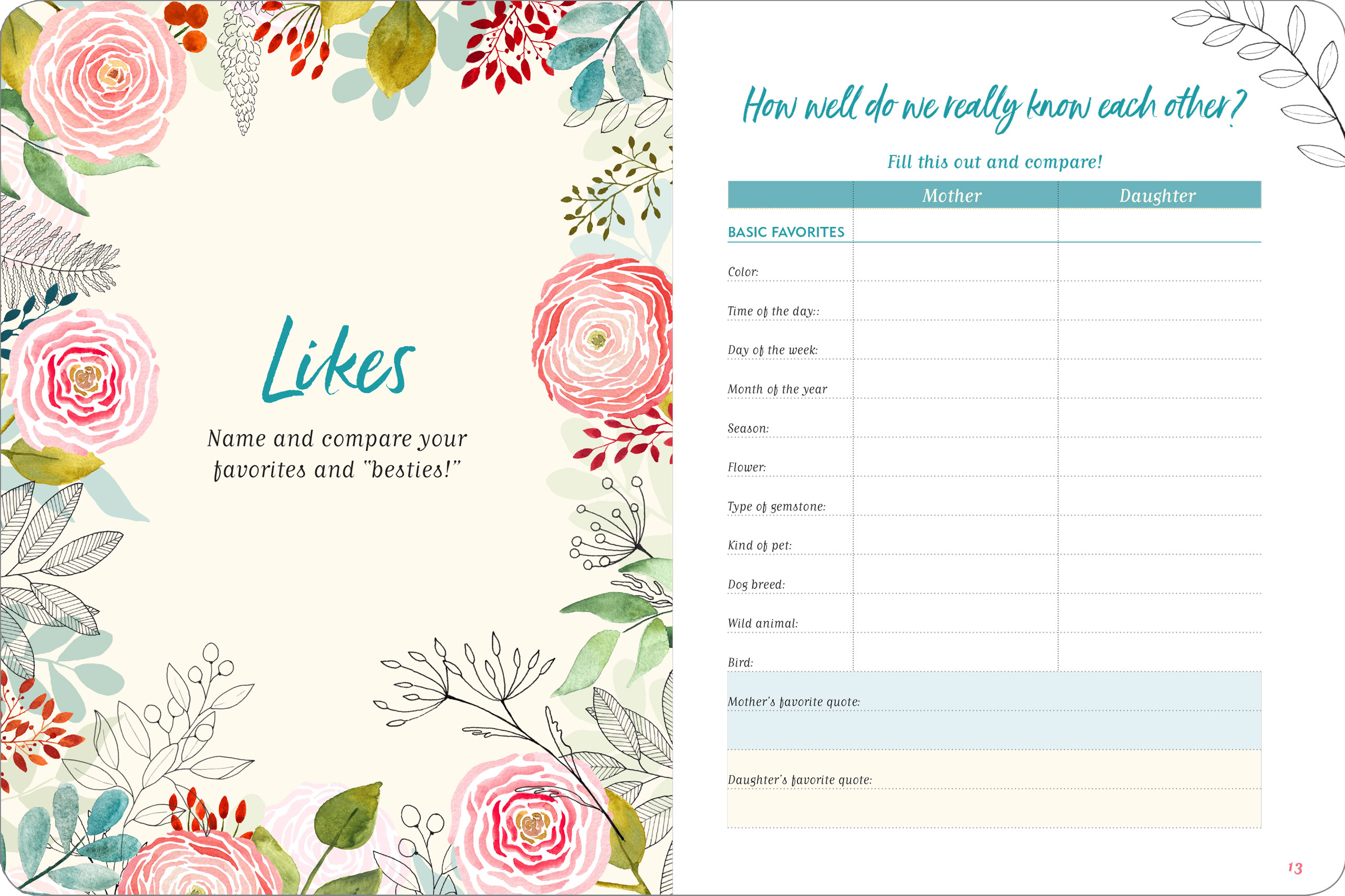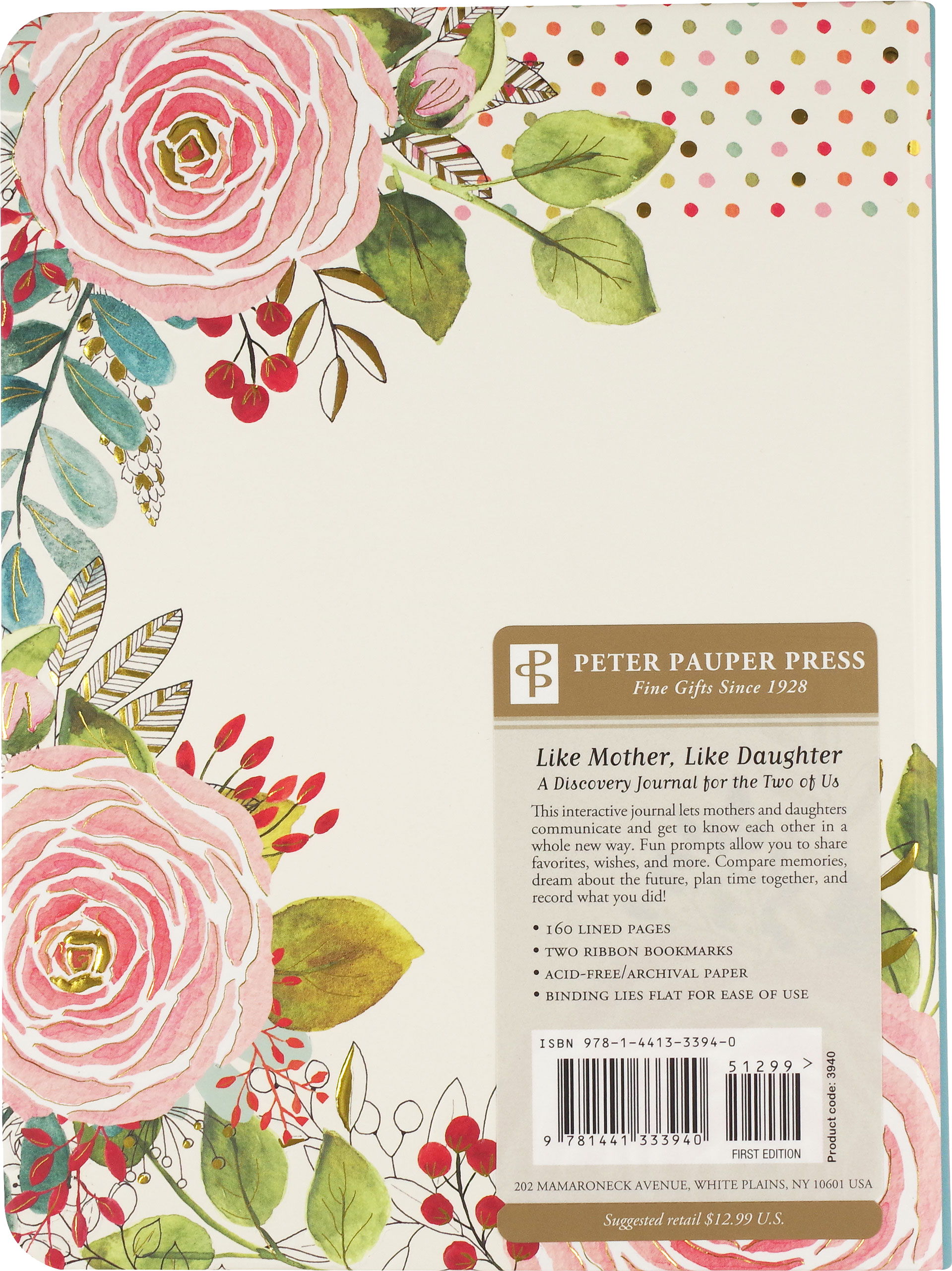 New design inside and out! Gorgeous covers feature a beautiful floral pattern on a matte ivory background, embellished with gold foil accents. Pattern is repeated throughout the interior. This appealing journal lets mothers and daughters spend time together, get to know each other better, and have fun, too. Easy prompts allow them to share favorites, wishes, pet peeves, much more. Compare family memories, plan the perfect trip, dream about the future, tell each other a story, plan time together, and record what you did! End up with a shared chapter in the story of your lives to enjoy again and again! Start or reinforce a lifelong journaling habit. Journal is written by a mother-daughter team. For daughters ages 9 and up, with their moms. Acid-free archival paper helps preserve memories. 6-1/4'' wide x 8-1/4'' high. 160 pages.