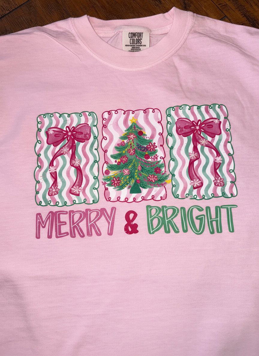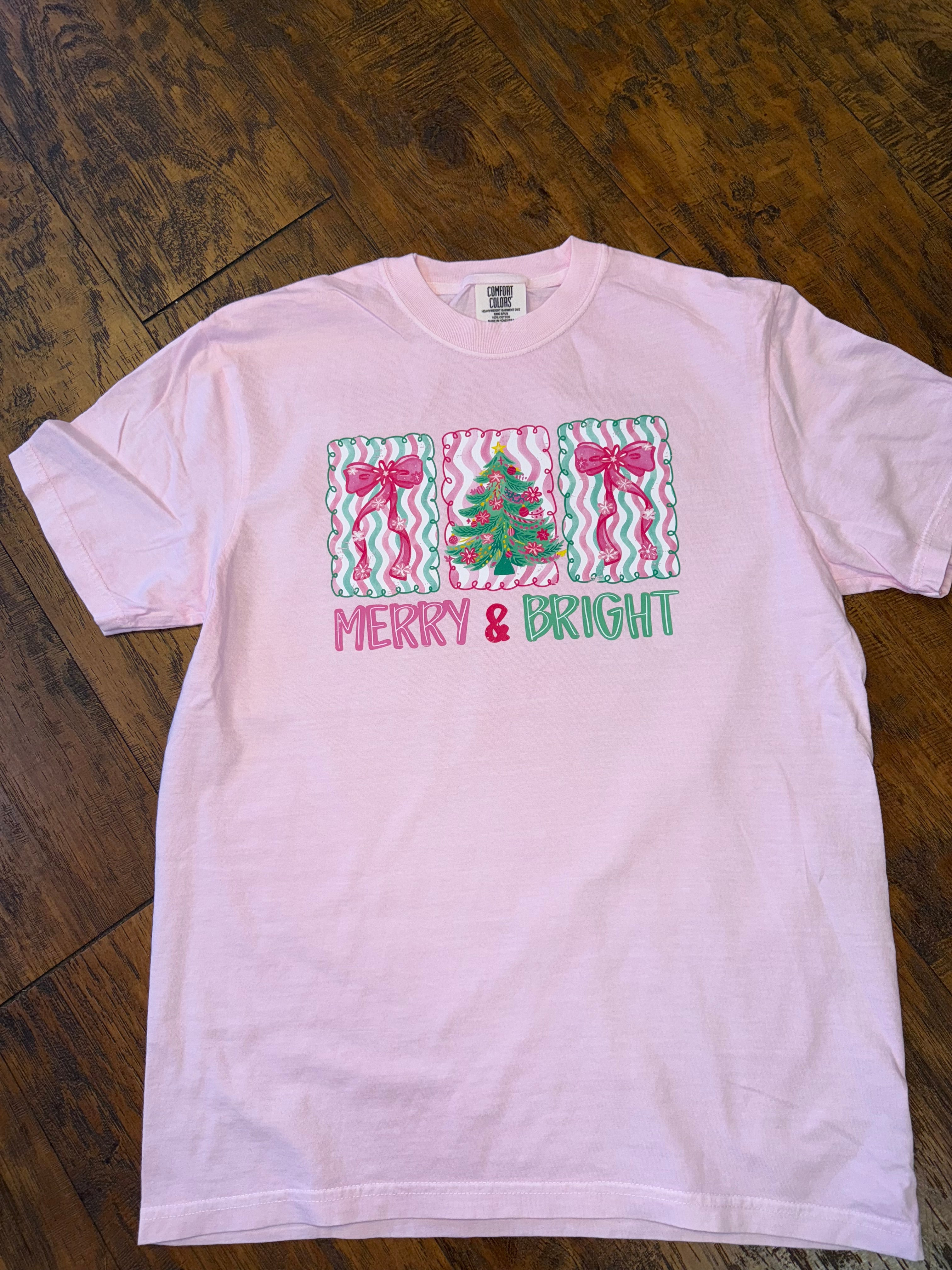 The Merry & Bright graphic tee features a DTF print on the Comfort Colors Blossom tee.