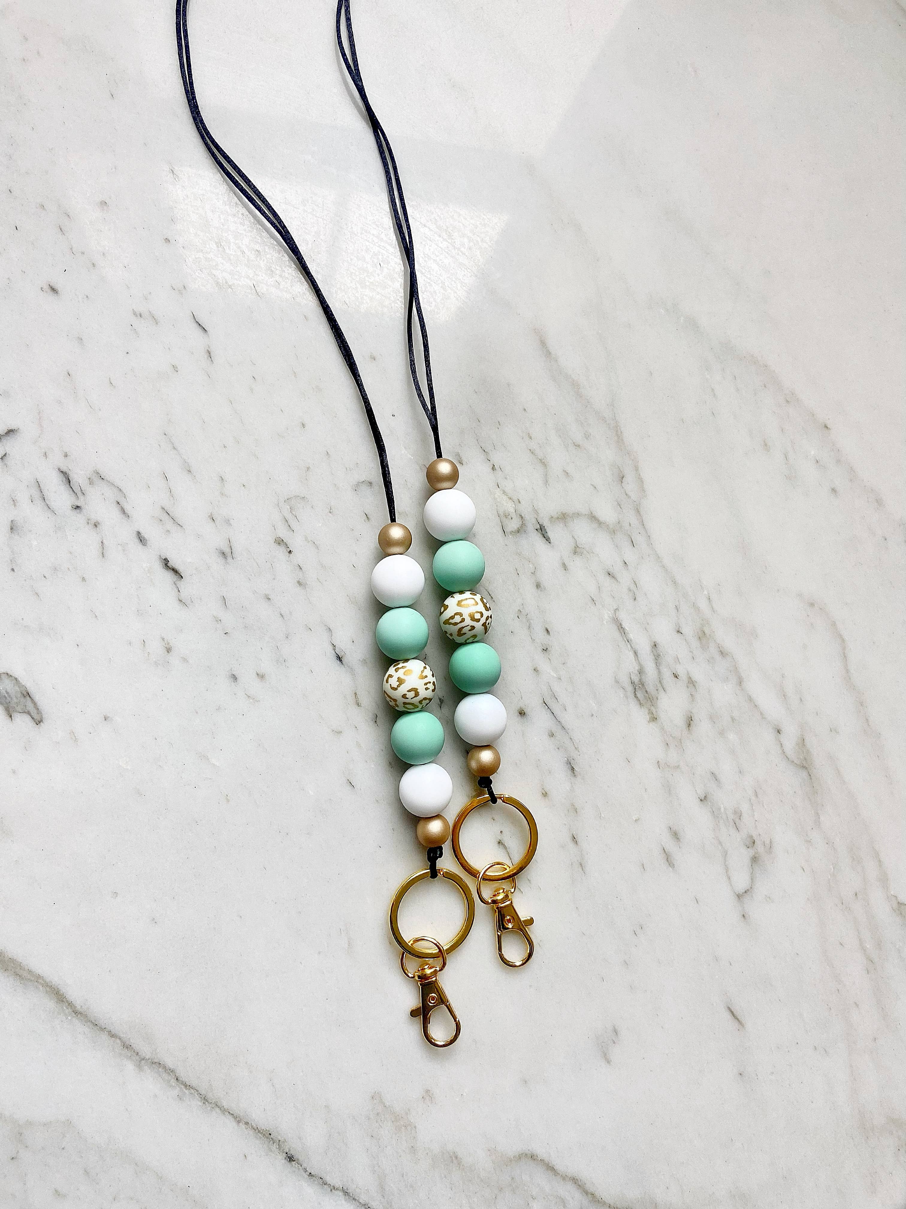 Lanyard is made with 5 15 mm silicone beads, split ring, clasp, two 12 mm gold silicone beads, and tassel. The lanyard makes it easy for you to attach your keys, school ID, or anything you need easily accessible throughout your day! This lanyard hangs on premium quality nylon satin cord.